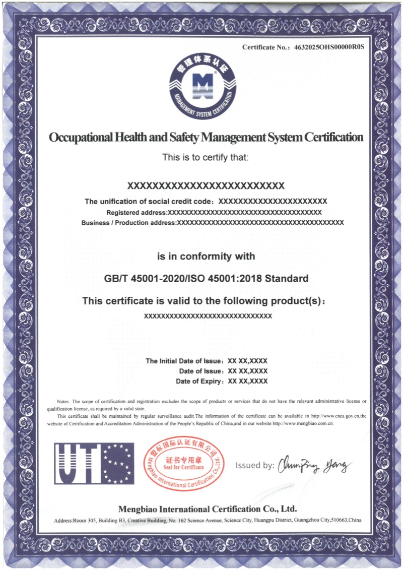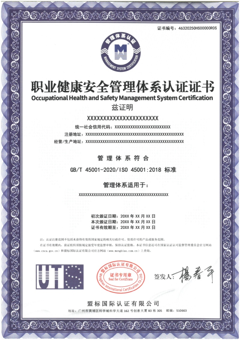 職業(yè)健康安全管理體系認證證書——英文版證書
