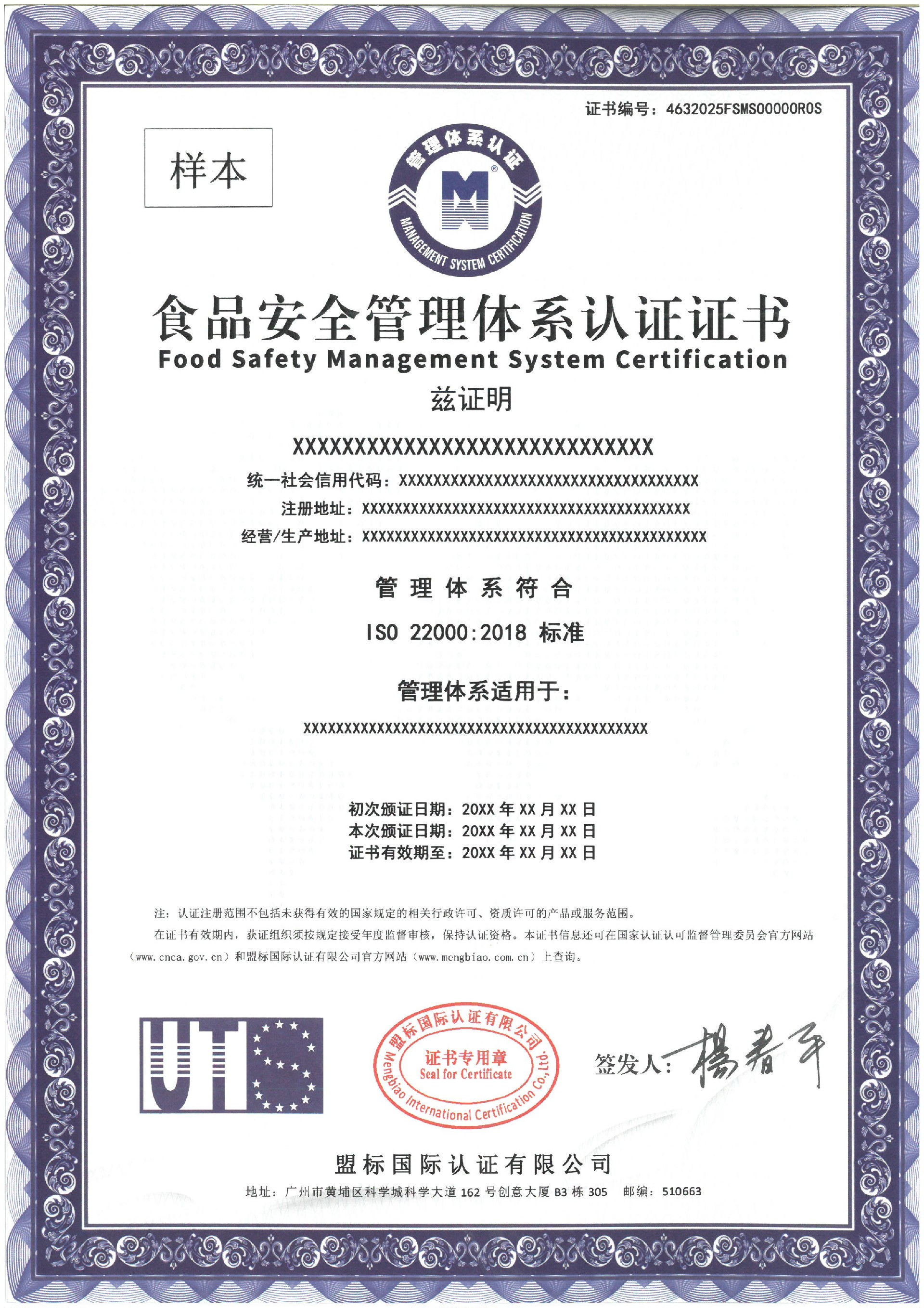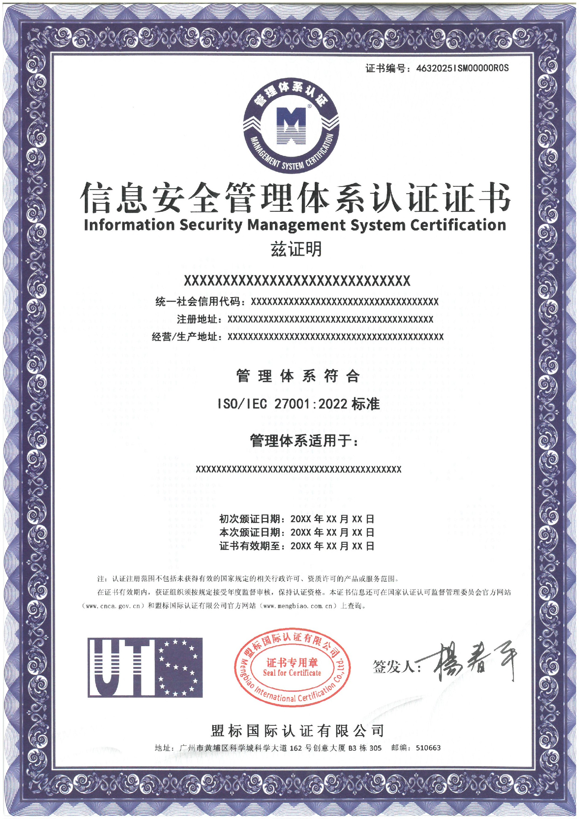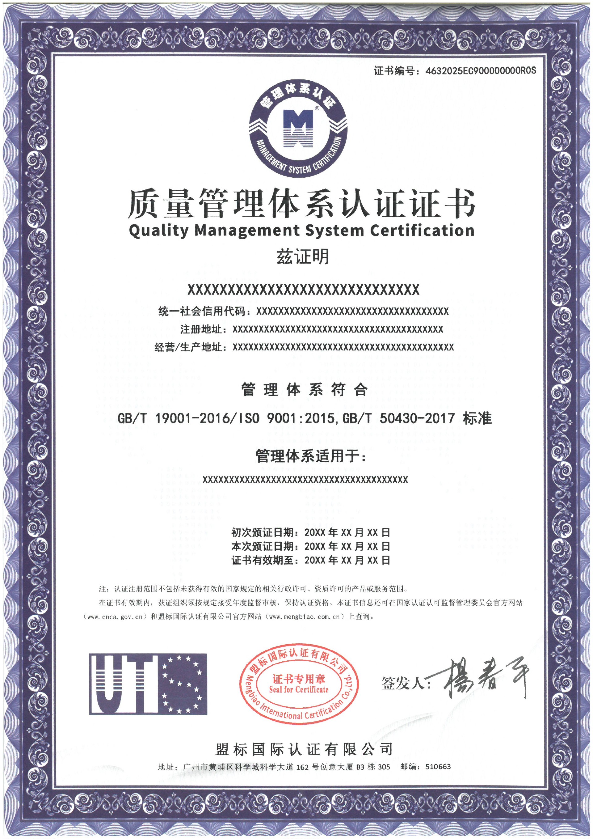 質(zhì)量管理體系認(rèn)證證書(QMS)-樣版