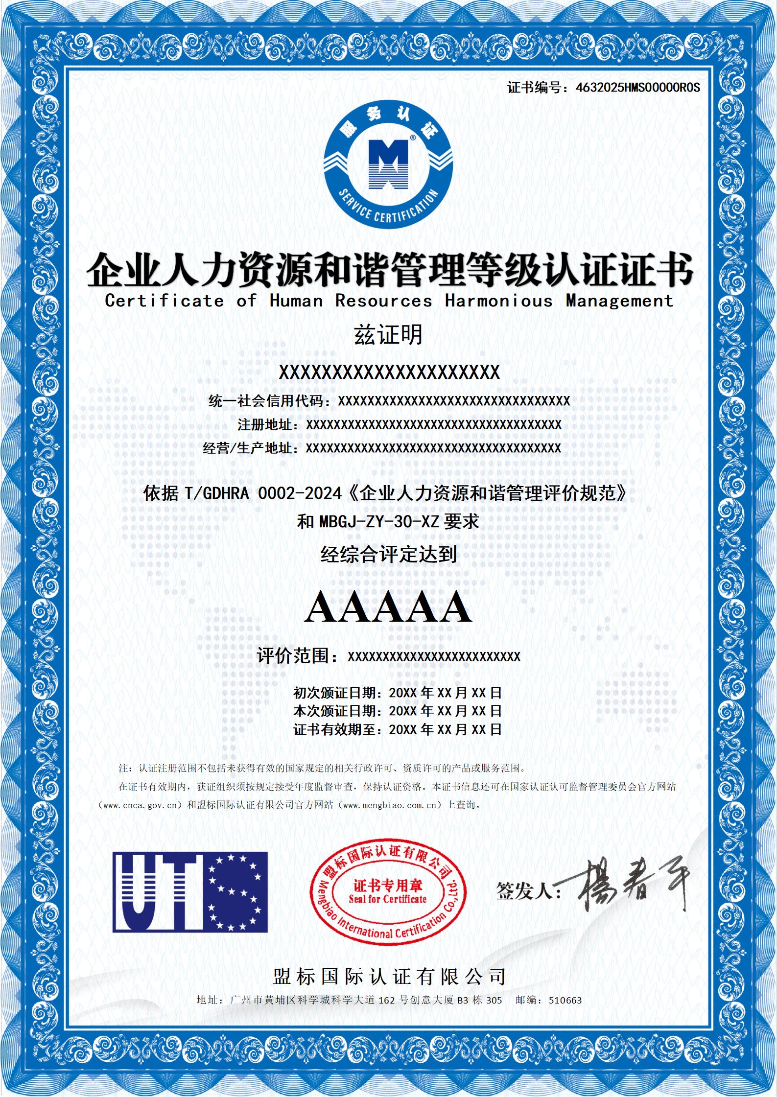 企業(yè)人力資源和諧管理等級認(rèn)證證書-樣版
