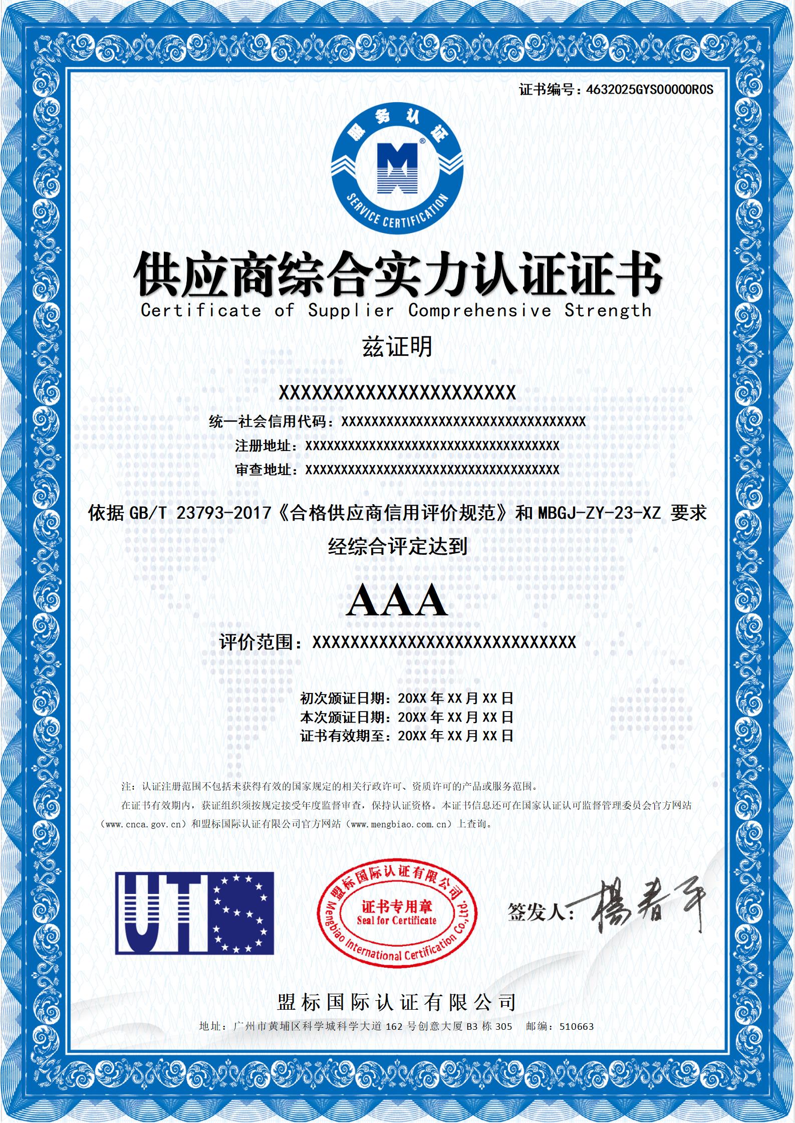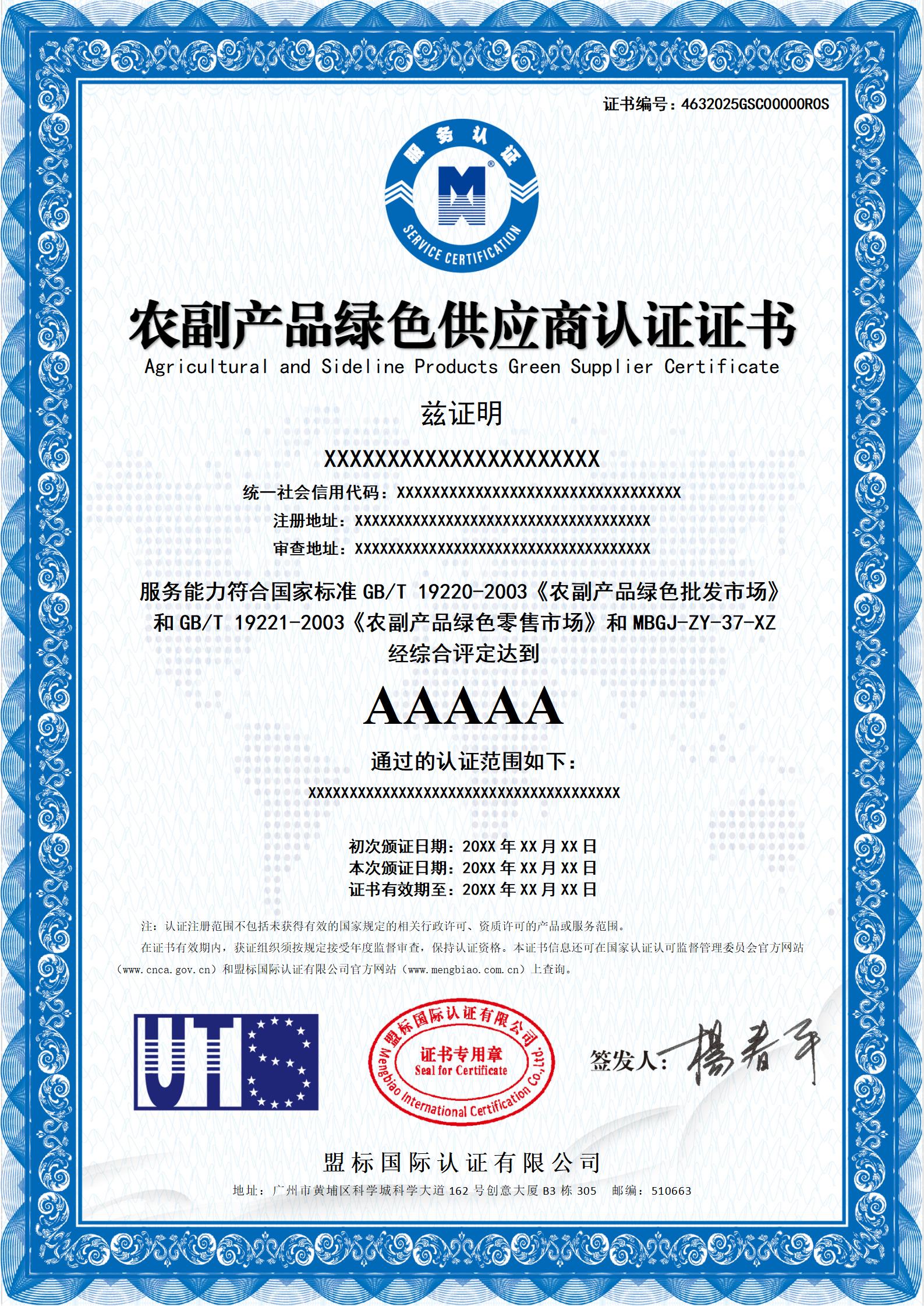 農(nóng)副產(chǎn)品綠色供應商認證證書-樣版