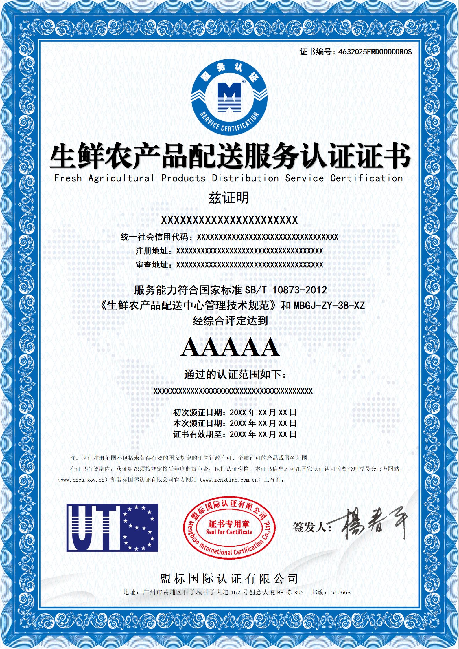 生鮮農(nóng)產(chǎn)品配送服務認證證書-樣版