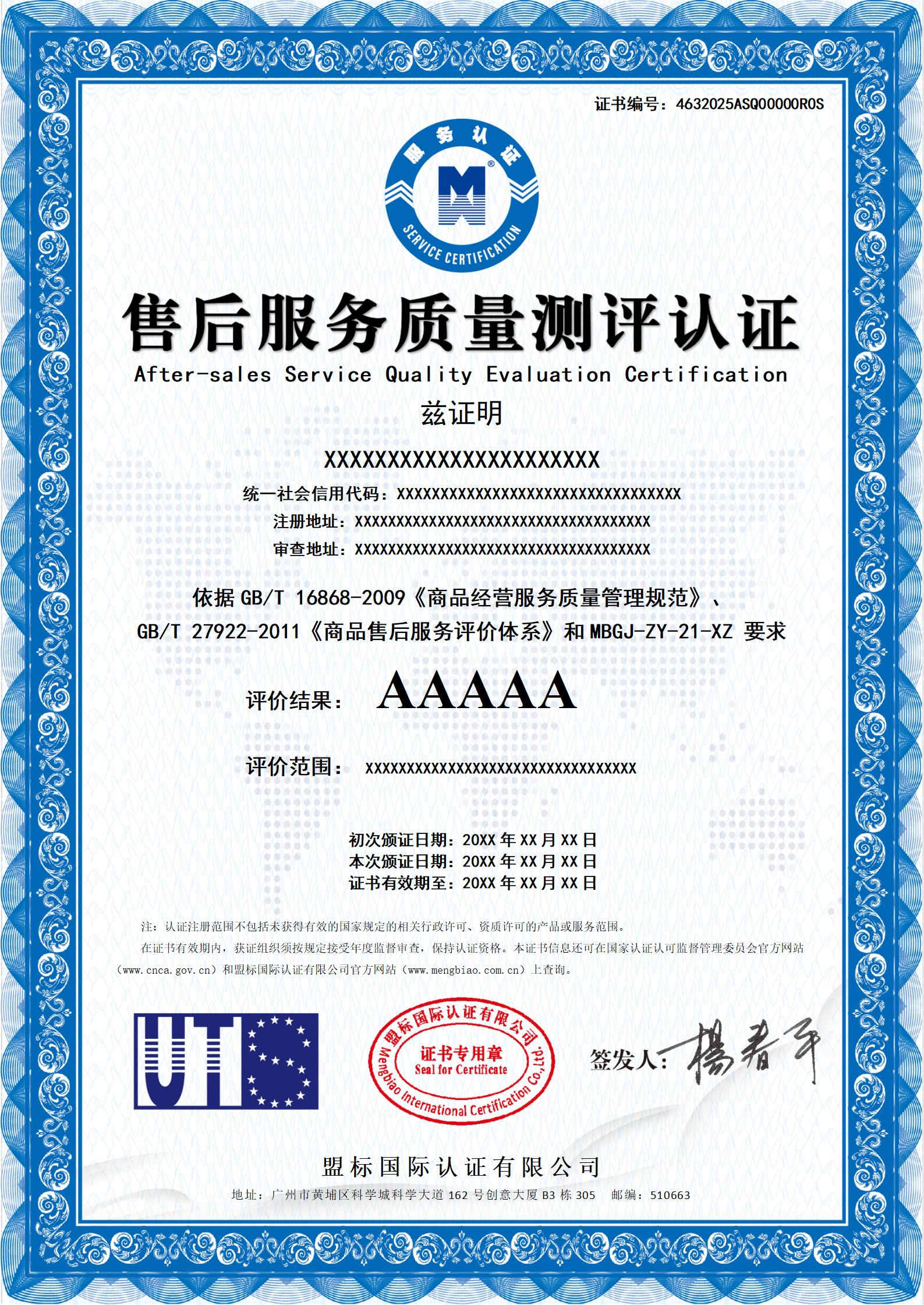 售后服務質量測評認證證書-樣版